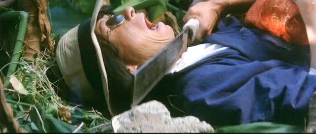 Filmdeki mizah anlayışı, dönemin Hong Kong sinemasının sınır tanımazlığını anlamak için de bir o kadar elzem. Özellikle aşk peşindeki iri yarı bir adam tarafından canlandırılan kadın yamyam karakteri, grotesk ve rahatsız edici bir mizahın ürünü. Bu karakterin Ajan 999’a olan ilgisi ve yaşanan kovalamaca, filmin tonundaki dengesizliği zirveye taşıyor. Bir yanda parçalanan uzuvlar, diğer yanda Benny Hill şovlarını aratmayan bir slapstick komedi. Hele ki o patenli kaçış sahnesi ve içinin doldurulmuş manda kafalarıyla yapılan dövüş sekansı, filmin gerçeklikle bağını tamamen kopardığı anlar olarak hafızaya kazınıyor ve izleyiciye “ben şimdi ne izledim?” sorusunu sorduruyor.